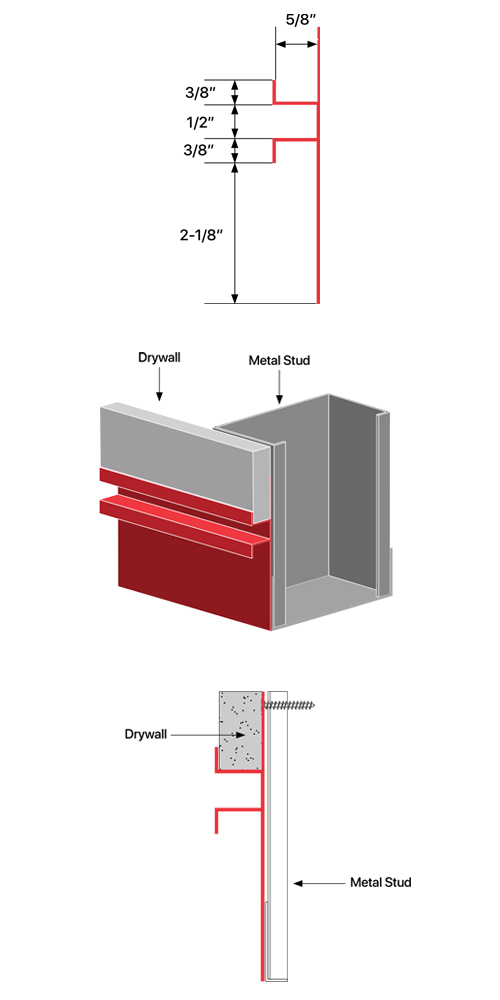 Striking profile that creates a recessed base at the bottom of a wall just above floor surface or at the top of a wall just below the ceiling surface. Double flange creates a reveal for visual impact as well as protecting the bottom of wall material and creating a lower recess. Can be used in conjunction with wrapped surface finishes such as fabric or vinyl wall coverings.