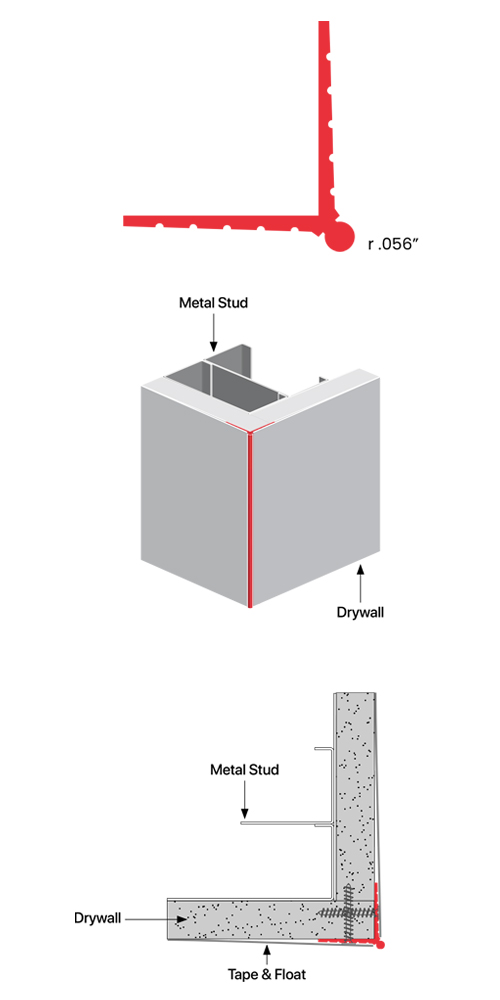 Minimalistic bead line corner profile. Provides corner protection and sleek design for vertical drywall corners. Can be used in conjunction with wrapped surface finishes such as fabric or vinyl wall coverings. Ridged faces for tape & float and pre-punched holes for easy install (hole placement may vary).