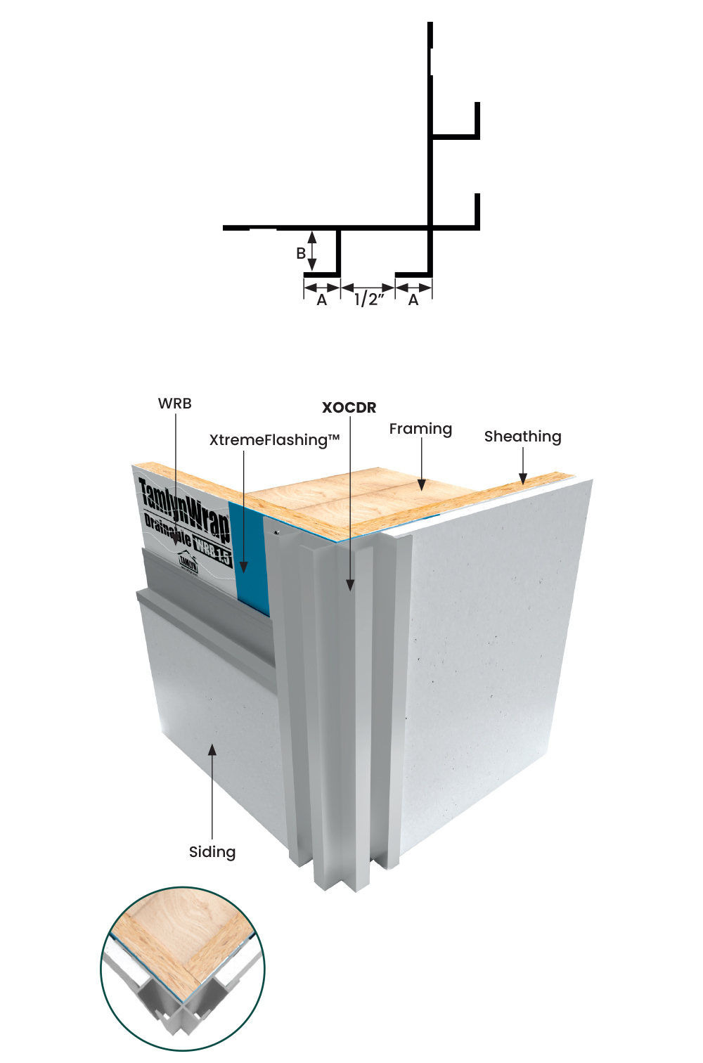 NOTE:ย Do not install XtremeTrimยฎ Double Reveal Outside Corner on horizontal applications where the exterior flange can catch/hold water.