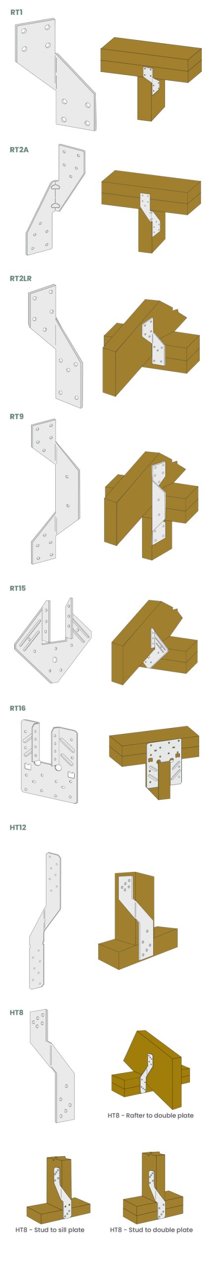 (RT & HT Series) Eliminate expensive, time consuming rafter notching, provide wind and seismic ties for trusses and rafters, fulfill specifications for resistance to lateral and uplift conditions. Also for general purpose tie use, strong back or attachments where one member crosses another.