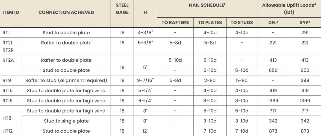 RT2A – universal rafter to double, plate/top plates to stud/stud to sill plate. Ergonomic design improves/speeds up and ease of installation.