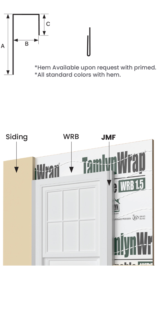 MATERIALS: Primed: .019″ ± .003 Galvanized steel with proprietary coating that protects against harsh weather conditions and allows for paint adhesion. Color Matched: .019 ± .003 Aluminum sheet coated 2 sides with paint system that is specifically formulated for exterior applications. Available in most popular Siding and Soffit colors. Specify color code using Color Palette on page 6. 8′ Length Standard. All dimensions are nominal. Hem available for special request.