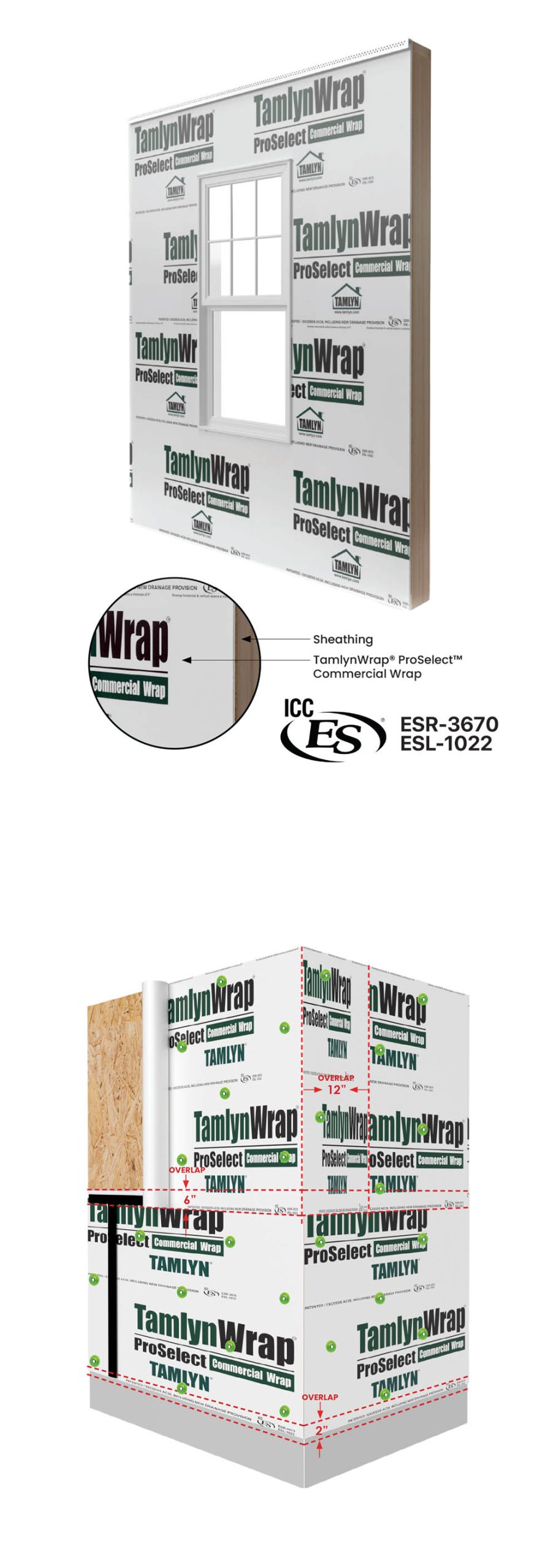 BEST PRACTICE INSTALLATION: ProSelect™ must be installed SHINGLE FASHION and integrated with other wall components to promote positive mechanical drainage. All horizontal and vertical overlaps shall be 6” with 12” vertical overlap at any corners. Cap fasteners must be used for attachment per installation guidelines.