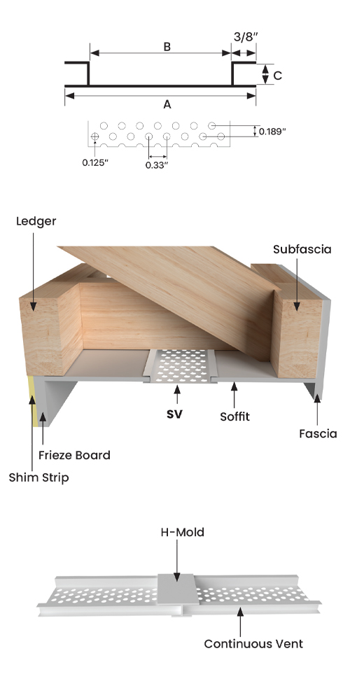 The best looking, most “framer-friendly”, easy to install, effective continuous soffit vent on the market. Unique double leg channels hide edges of soffit material for clean look and help prevent vent from being pulled up into subfascia. Complies with the International Residential Code requiring that ventilation be balanced 50% exhaust / 50% intake