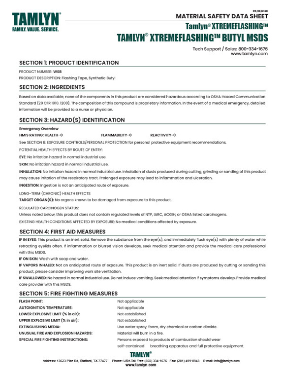 Tamlyn XtremeFlashing Butyl Safety Data Sheet